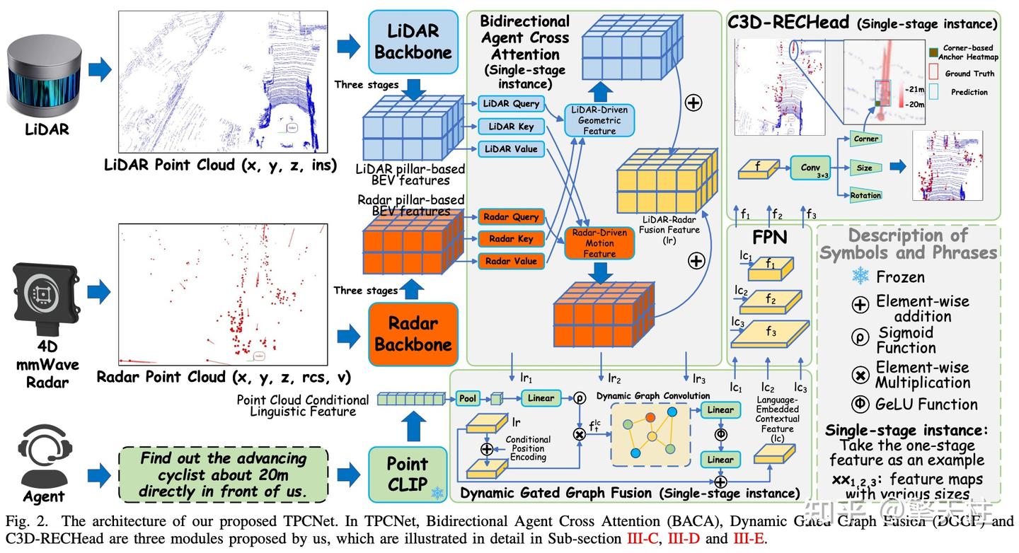 • 提出基于跨模态注意力机制的LiDAR-Radar点云融合框架(Talk2PC),通过动态权重分配策略融合LiDAR的高精度几何特征与雷达的运动多普勒特征,实现多源异构数据的语义对齐与互补。