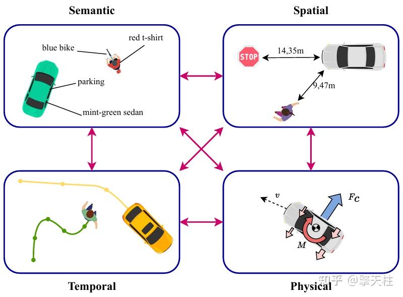 • 提出首个系统性评估MLLMs在自动驾驶场景理解能力的框架,整合语义(Semantic)、空间(Spatial)、时间(Temporal)、物理(Physical)四大核心维度,并引入 预测能力(Anticipation)作为跨维度关联的关键纽带,突破传统单一维度评估的局限性。