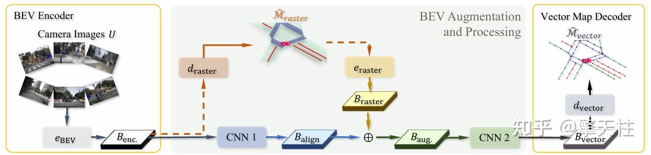 • 提出一种新型潜在空间增强机制,通过将光栅解码器预测的中间光栅地图(Raster Map)编码为空间特征,并与原始BEV潜在网格相加,直接注入密集空间监督信息,从而强化BEV潜在空间的结构化表征能力。