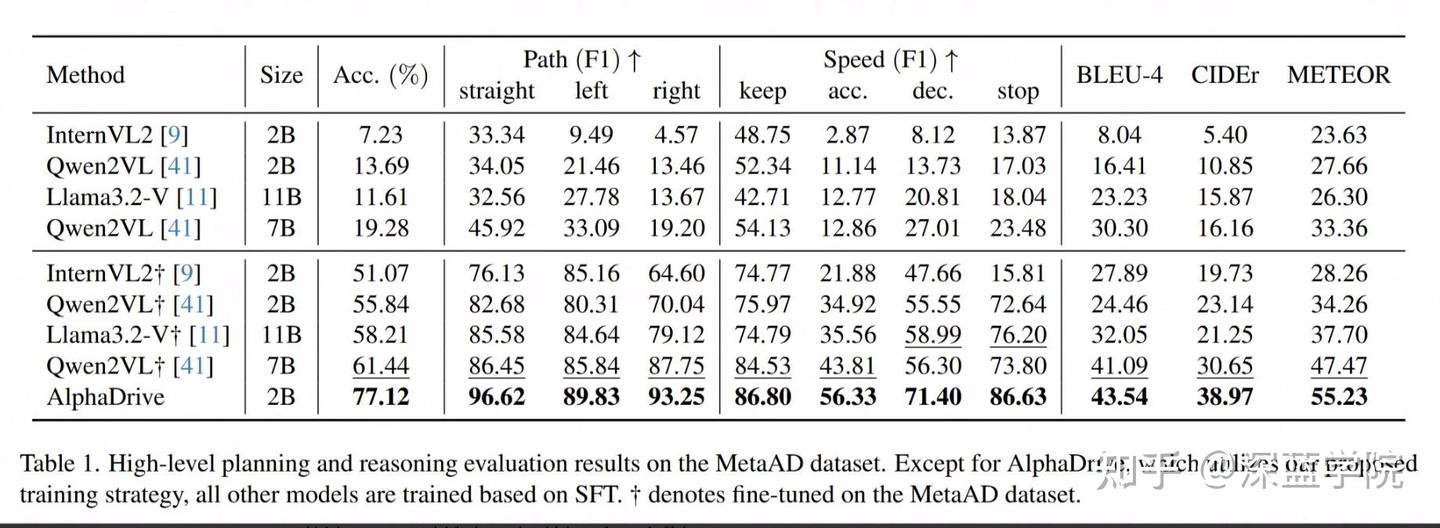 评估:评估指标包括两个方面。首先,通过计算所有横向和纵向元动作类别的 F1-Score 来衡量元动作规划的准确性,然后是整体规划准确性。此外,对于规划推理用 BLEU-4、CIDEr 和 METEOR 分数计算生成的规划推理过程与数据集中标注的推理过程之间的相似性。