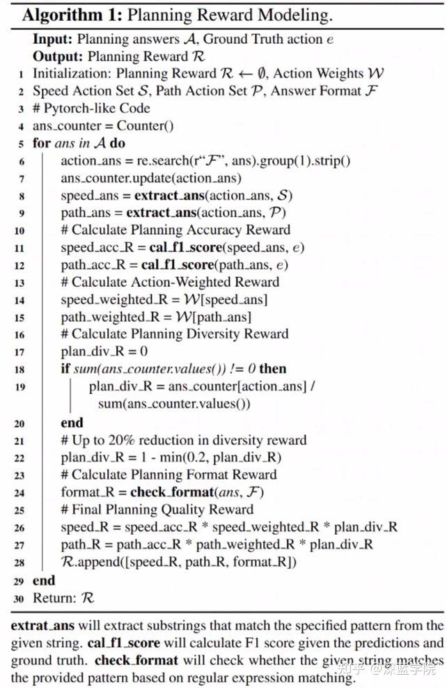 规划准确性奖励:在数学或编程等领域,GRPO 的奖励可以直观地根据最终答案是否正确来确定。然而,规划更为复杂,涉及横向(方向)和纵向(速度)两个维度,且动作集合受到约束。因此,使用 F1 分数分别评估横向和纵向决策的准确性,并据此分配奖励。采用 F1 分数进行评估,因为它不仅防止模型学习捷径解决方案(输出所有决策可能导致高召回率但低准确率),还提高了训练初期的稳定性。