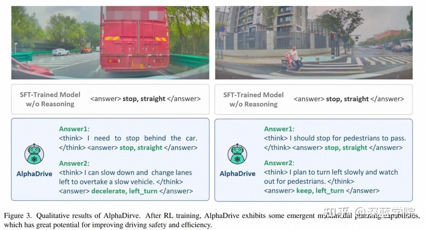 图3 展示了AlphaDrive 在RL训练后的多模态规划能力。在复杂场景中,它可以有效生成多个可行解决方案,而SFT训练的模型只能生成单一的规划决策。AlphaDrive可以与下游动作模型集成,动态地从多个选项中选择最优解决方案。