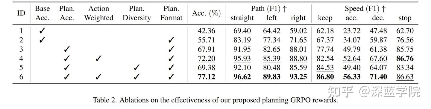 规划奖励:表2 验证了四种GRPO规划奖励的有效性。使用基础准确性奖励的模型在所有指标上显著落后(ID1),而结合规划格式奖励后略有改善(ID2)。采用提出的规划准确性奖励后,性能显著提升(ID3)。进一步结合动作加权奖励后,加速/减速决策得到了增强(ID4)。最终,结合规划多样性奖励,实现了最佳规划性能(ID5-6)。