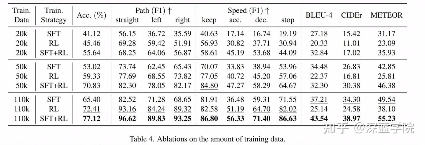 训练数据量:表4展示了训练数据量对不同训练策略的影响。当训练数据量减少时,SFT受到的影响更大。仅使用20k训练样本时,使用RL训练的模型规划准确性达到 46.08%,显著高于SFT训练的模型。当使用近一半数据(50k样本)时,AlphaDrive的规划准确性已达到 70.83%,证明了训练策略的高效性。