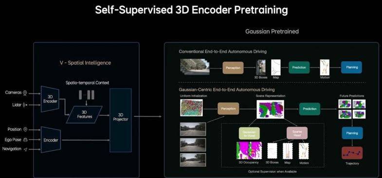 在MindVLA的架构中传感器数据没有直接输入到基座大模型中,而是先经过了一个V-Spatial Intelligence的模块,这个模块能根据传感器的原始输入形成对3D物理世界的理解,和大语言模型相比,有更强的空间感知能力,这其中关键的技术是使用了3D高斯表征。