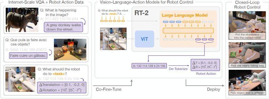 RT-2的结构非常简单,图像信息经过VIT编码后和语言信息的token一起输入到LLM中,谷歌在这里使用了自家的Gemini,模型输出一系列的Action token,解码后转化为机械臂的控制信号。