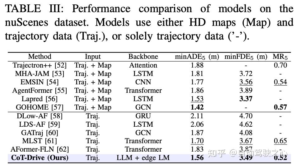 作为无地图框架,CoT-Drive在min ADE5、min FDE5和MR5上分别提升8.34%、5.16%和2.50%,证明其通过CoT提示学习复杂场景特征的能力。