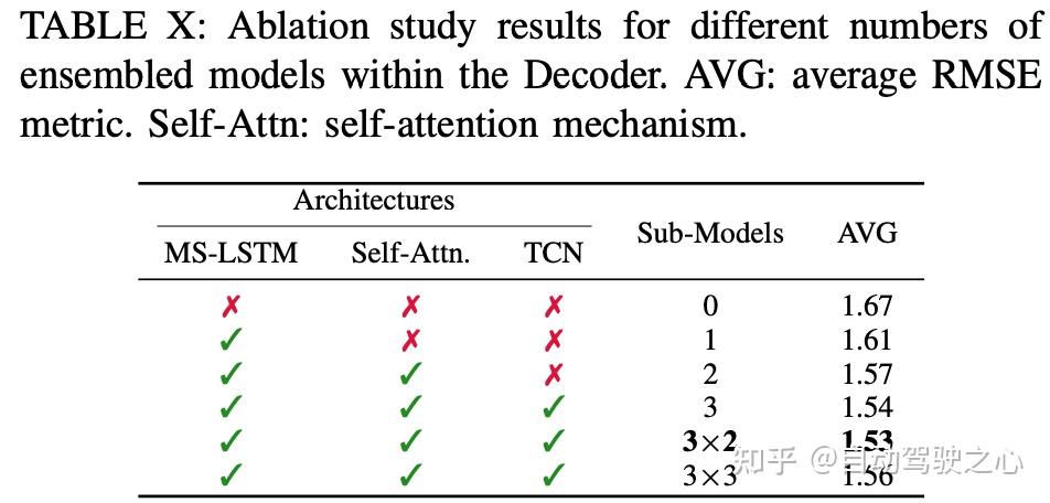 表X表明,采用6个子模型(MS-LSTM+自注意力+TCN组合)的集成策略最优,超过9个子模型配置。证明适度的模型复杂度平衡对处理交通不确定性至关重要。