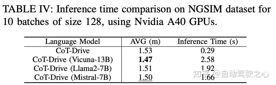 为评估CoT-Drive的效率,作者在NGSIM和nuScenes数据集上测试了不同配置的推理速度。表IV显示,虽然Vicuna-13B版本精度最高(提升3.92%),但其推理时间增加12.7倍,难以满足实时性需求。表V进一步对比nuScenes数据集上12个智能体的预测表现:Llama2-7B和Vicuna-13B版本的推理速度分别比原始CoT-Drive慢12倍和20倍,但精度增益有限。这表明作者的方案在保持高效推理的同时显著提升了预测精度,有效解决了研究问题Q1。