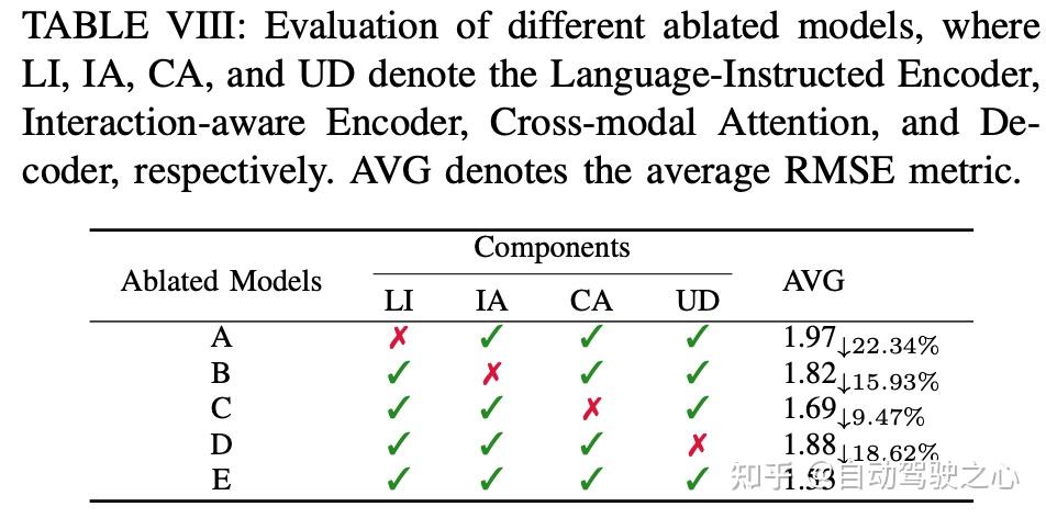 通过教师-学生框架,GPT-4 Turbo指导轻量级LMs(GPT-Neo/Qwen 1.5/TinyLlama/Phi 1.5)理解驾驶场景。表VI显示,这些模型在城市和高速场景中均表现出色(F1分数达0.94-0.97)。表VIII表明,移除知识蒸馏(模型A)会导致性能下降22.34%,验证了该策略对轻量模型继承LLMs高级推理能力的关键作用。