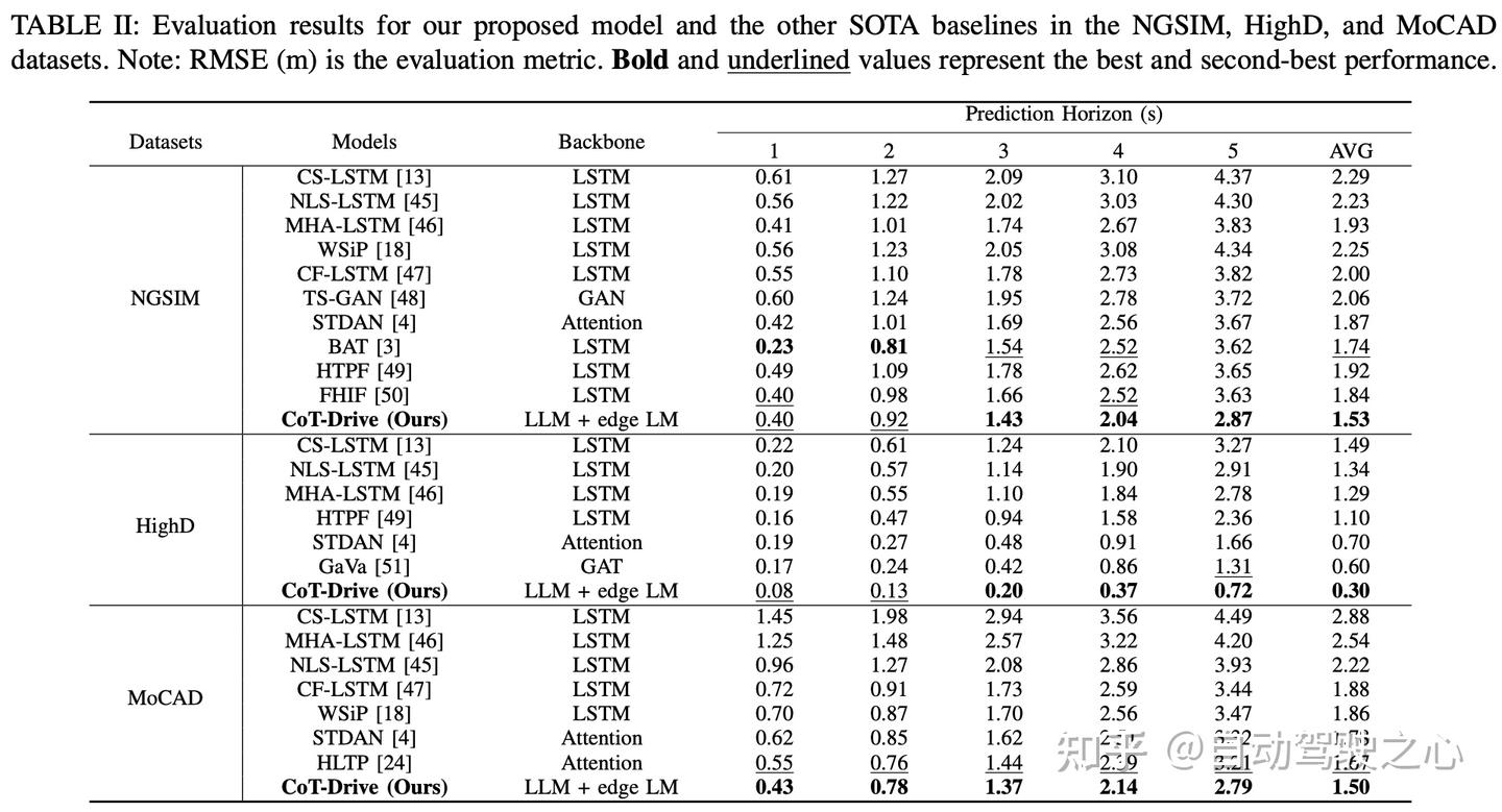 表I-III展示了CoT-Drive在五个数据集上的对比结果: