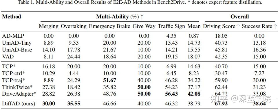 表格1中的总体结果表明,DiffAD明显优于包括UniAD和VAD在内的基线方法,并且超过了ThinkTwice和DriveAdapter等基于蒸馏的方法的性能。