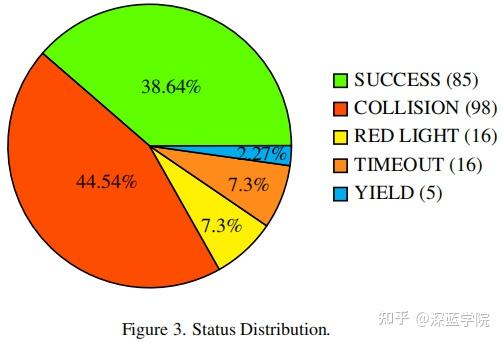 分析表明,很大一部分路径失效是由与交通智能体发生碰撞导致的,这表明在CARLA v2中的交互存在挑战。此外,少数失效是由于超时造成的,通常是由于规划模块在停止后偶尔无法恢复运动引起的,通过利用专家蒸馏或者加入更多的交通信号灯交互数据可以有效地缓解这个问题。一小部分失效发生在智能体闯红灯时,可能是由于CARLA中交通信号灯的渲染质量低或者存在具有挑战性的光照条件使其难以检测。