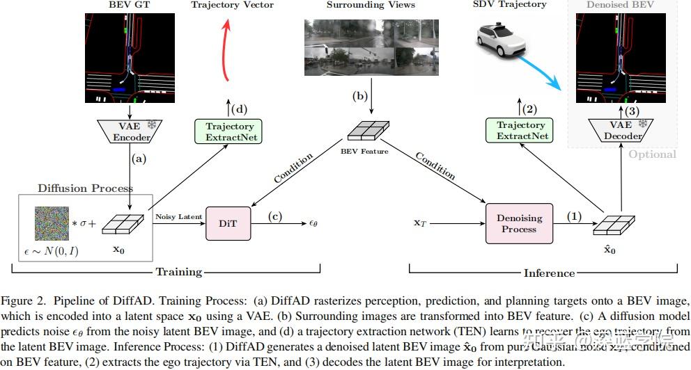 概述:如图2所示,DiffAD由三个主要部分组成:潜在扩散模型、BEV特征生成器和轨迹提取网络(TEN)。