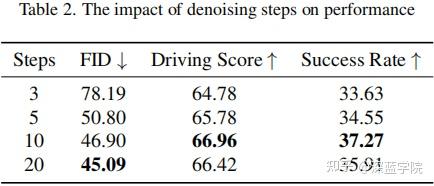去噪步数对性能的影响:DiffAD的迭代去噪遵循由粗到精的细化过程,逐步地改进感知和规划。如表格2所示,将去噪步数从3增加到10可以显著降低FID(-53.5%),同时提高驾驶得分(+2.18)和成功率(+3.64),这表明多步细化有助于解决轨迹模糊问题。然而,将步数扩展到10以上(例如,扩展到20)会导致性能饱和,这表明计算开销和规划精度之间达到了最佳平衡。