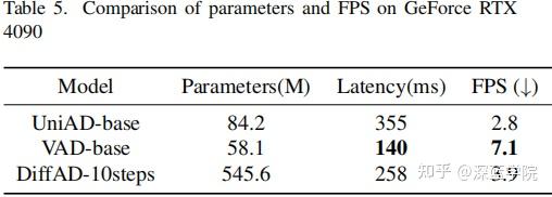 统一生成建模的效率:如表格5所示,尽管DiffAD的参数规模更大(545.6M vs VAD的58.1M),但是它实现了具有竞争力的延迟(258ms vs 140ms)和实时FPS(3.9)。