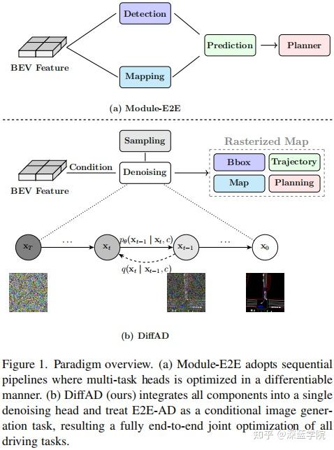 端到端自动驾驶目前是有望实现完全自动驾驶的一条有前景的途径。然而,现有的端到端自动驾驶系统通常采用主干网络与多任务头结合的方式,但是它们存在任务协调和系统复杂度高的问题。为此,本文提出了DiffAD,它统一了各种驾驶目标并且联合优化所有驾驶任务。实验结果证明了该方法的优越性。