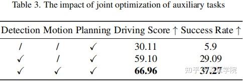 任务联合优化的影响:本文研究了联合优化辅助任务对规划性能的影响。如表格3所示,三个任务的联合优化实现了最佳的结果,突显了任务联合优化在提高规划性能方面的重要性。