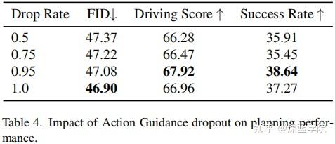 行为引导dropout的影响:直观上,过度依赖先前的决策会增加关键紧急情况下的响应延迟。相反,在不考虑先前行为的情况下做出决策可能会导致突发的感知错误,从而导致不切实际的规划结果。为了更好地理解这种权衡,本文分析了行为引导模块中不同dropout率对规划性能的影响。表格4展示了不同dropout率的结果。0.95的dropout率实现了最佳平衡,这表明保留一小部分先前的行为引导有利于鲁棒的规划。