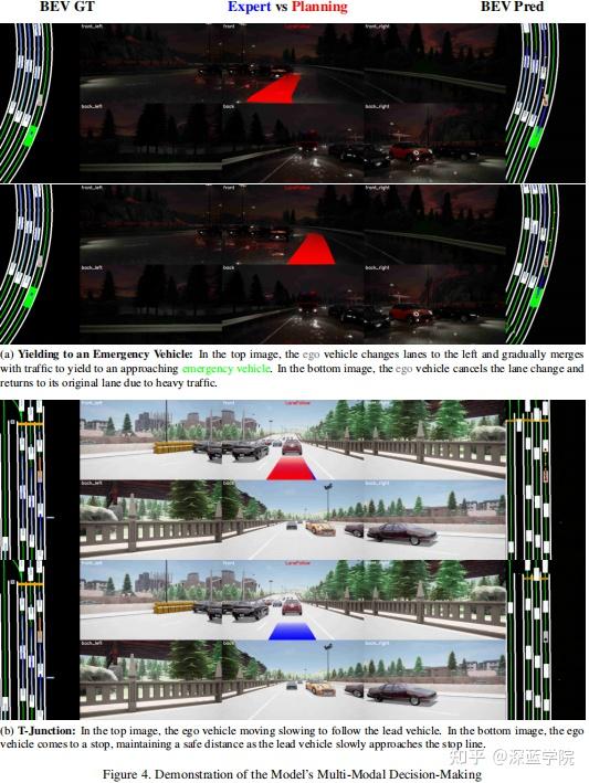 生成建模的多模态:在图4中,本文展现了定性结果,其展示了DiffAD强大的生成能力及其产生不同规划结果的能力。对于每种场景,本文通过采样不同的潜在变量来生成两个决策。本文将规划轨迹(红色)和专家轨迹(蓝色)叠加到环视相机的原始前视图像上。BEV真值(GT)显示在左侧,而预测的BEV显示在右侧。值得注意的是,生成的BEV与真值密切对齐,并且各种规划的轨迹始终是安全且合理的。这展现了DiffAD准确感知环境和有效学习交互行为的能力。