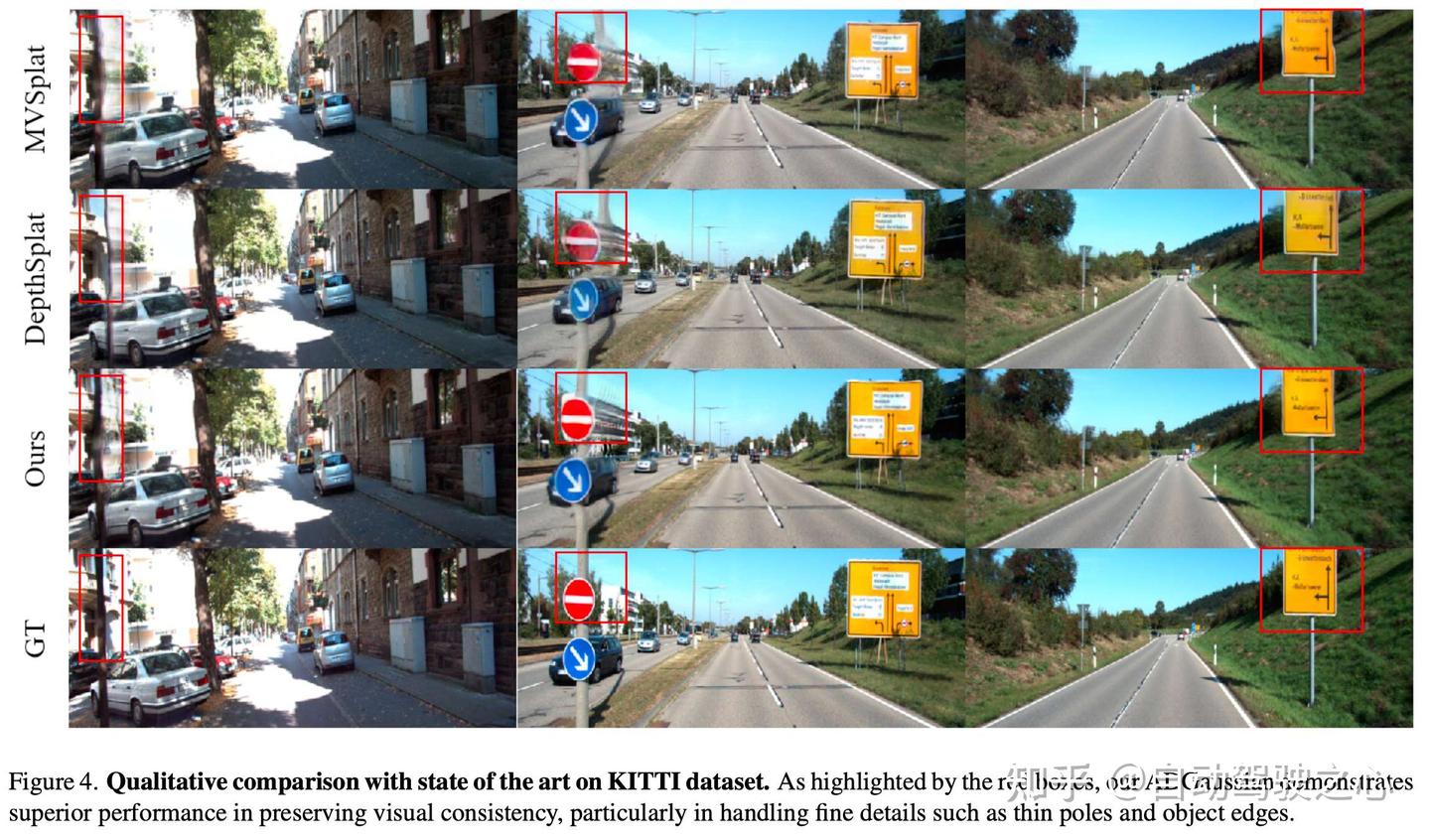 我们在图3和图4中提供了两个数据集的定性比较。可以看出,我们的模型在遮挡区域和细小细节(如纤细信号杆)方面实现了优越的渲染质量。