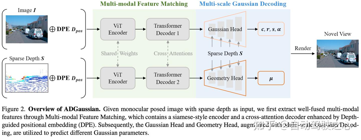 在本节中,我们寻求一种有效的方法,将稀疏LiDAR深度整合到GS中,并充分利用多模态特征。为此,我们提出了一种专为城市场景设计的多模态特征匹配架构,以实现稀疏深度信息与彩色图像数据的同步整合。在此过程中,深度引导的位置嵌入将深度线索整合到位置嵌入中,增强了3D空间感知并改善了多模态上下文理解。