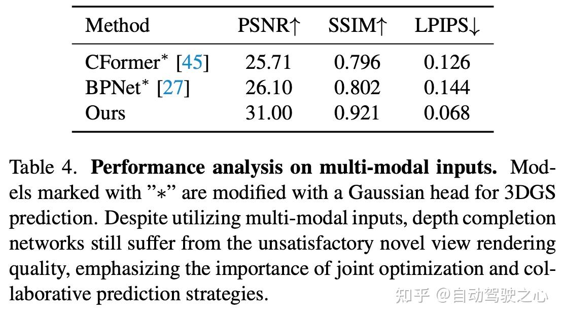 多模态输入分析。为了确保公平比较,我们使用最先进的深度补全方法构建了具有相同多模态输入的基线网络。具体来说,我们将CFormer和BPNet重新实现为比较目标,这些模型同时接受深度和图像作为输入,并使用多模态融合特征预测高斯参数。如表4所示,显然,仅增加额外的深度输入并不能显著提高新视角渲染的质量,进一步突显了我们联合优化的关键需求。此外,图5中的深度比较结果显示,我们的模型在捕捉细粒度细节(如保持汽车和杆子形状)方面表现出色,即使没有在深度补全任务上进行预训练。