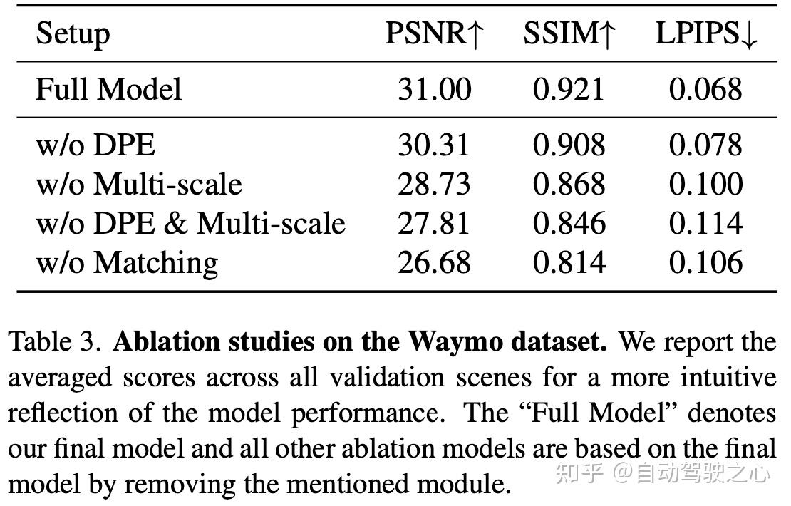最后,为了展示我们同步多模态优化公式的效果,我们展示了不使用多模态特征匹配(w/o Matching)的结果,用下一帧的颜色图像替代稀疏深度输入。显然,多模态特征匹配在PSNR、NDS和mAP方面带来了显著提升(分别为4.32、10.7%和3.8%),突显了图像相关外观特征和深度相关几何特征信息交换和同步优化的重要性。