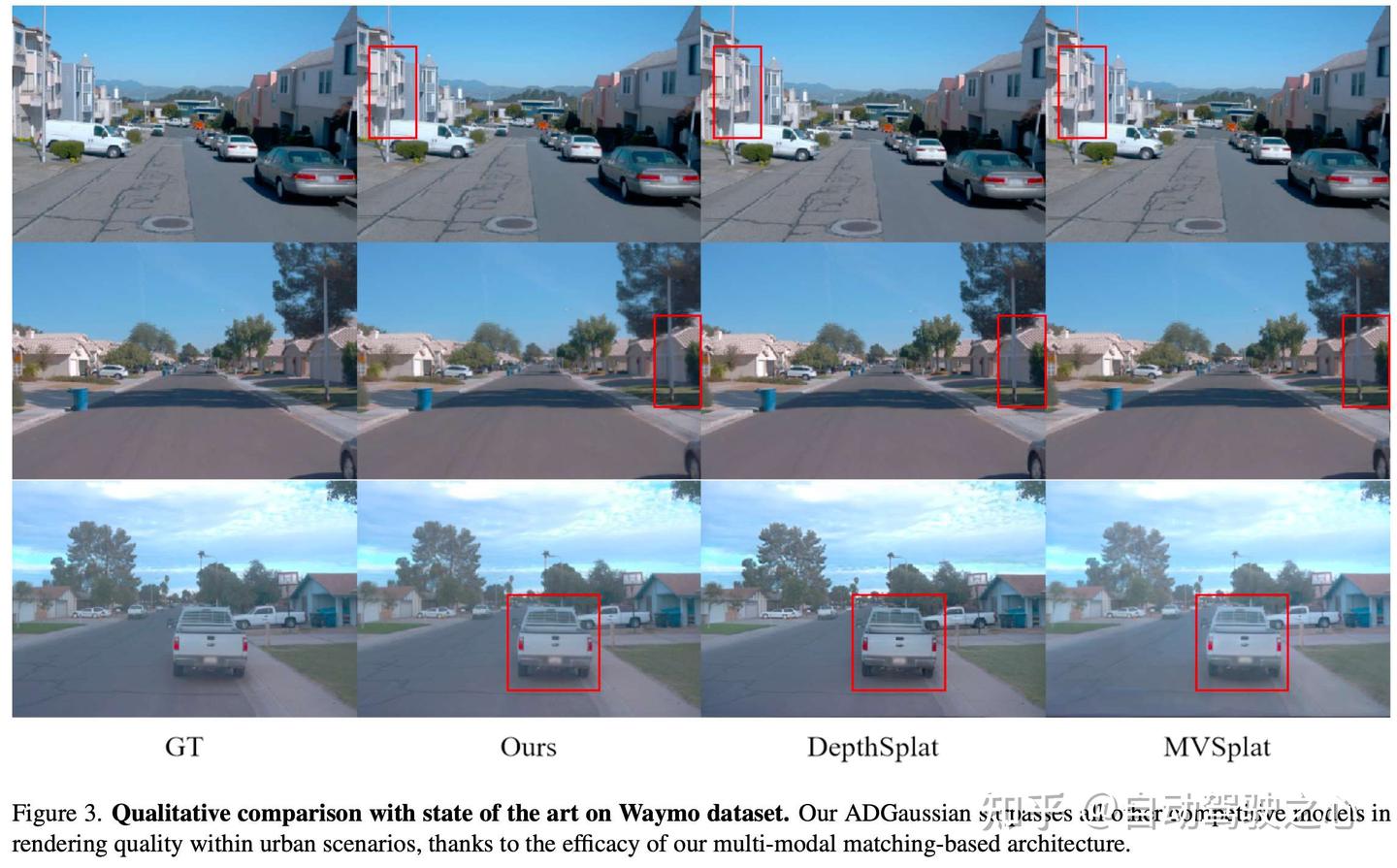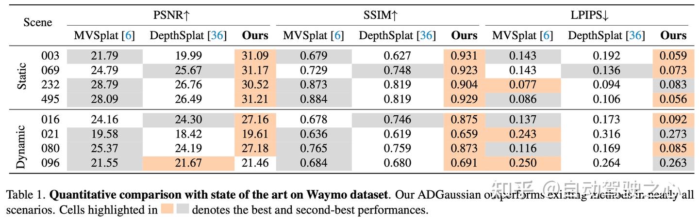 Waymo和KITTI基准上的定量比较分别在表1和表2中呈现。在Waymo数据集上,我们的ADGaussian在几乎所有视觉度量上都超过了先前的最先进模型,特别是在静态场景中表现尤为显著。此外,我们的方法在不同场景中表现出一致的性能,突显了其多模态特征匹配能力的稳健性。