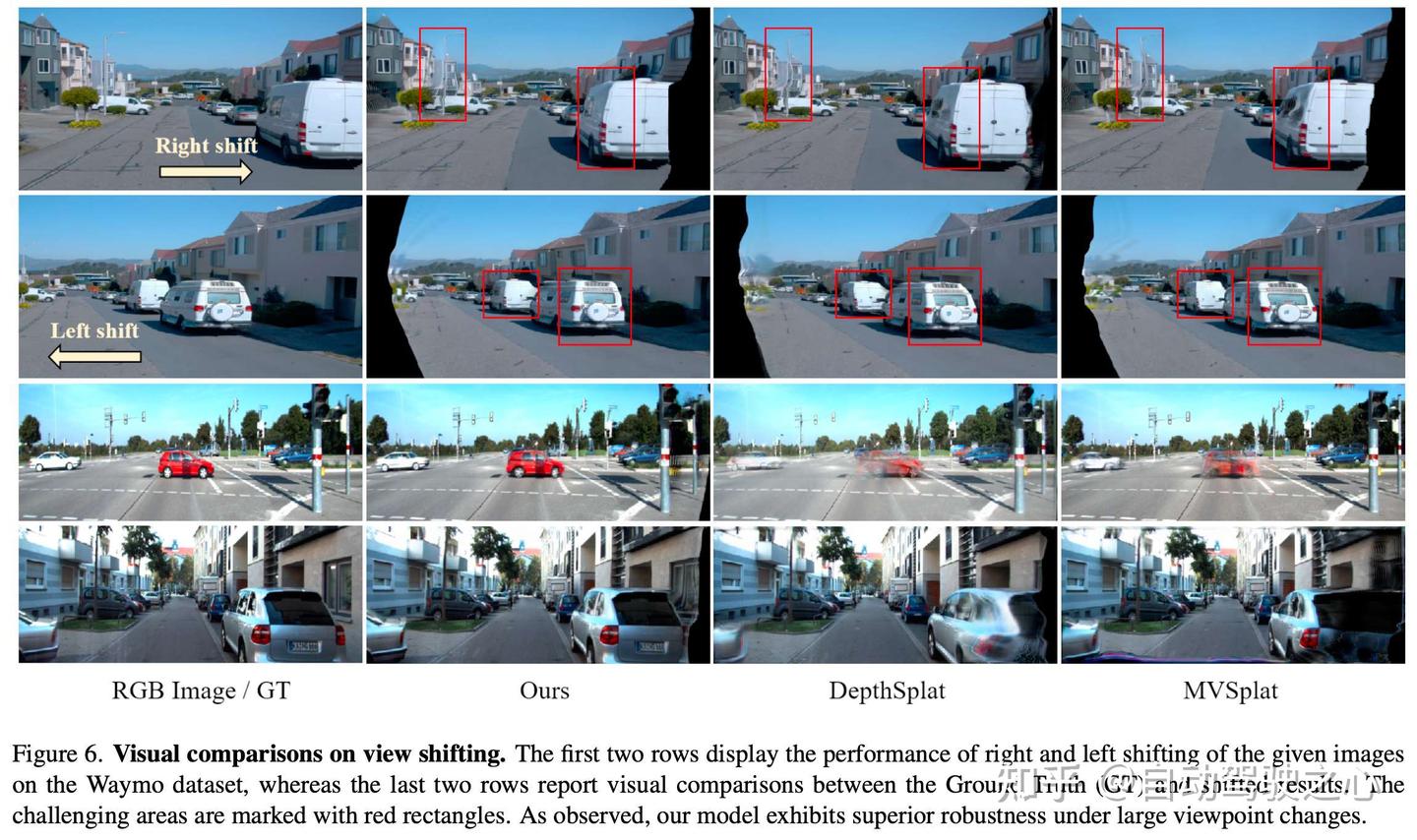新视角变换的概念涉及从与训练数据中存在的原始视角显著不同的视角生成图像。这项任务特别苛刻,通常需要可靠的深度估计来处理视角、尺度和遮挡的大幅变化。在这项研究中,我们进一步调查了模型在视角变换中的稳健性。首先,使用KITTI数据集中提供的真实右相机图像来评估视角变换的定量性能。如表6所示,我们的模型在零样本视角变换(从左相机到右相机)中显著优于MVSplat和DepthSplat。值得注意的是,我们的零样本视角变换结果仅略低于正常训练模型(PSNR:23.60,SSIM:0.776,LPIPS:0.164)。此外,两个数据集的视觉比较如图6所示。无论是向右还是向左变换,我们的ADGaussian在Waymo数据集上表现出卓越的整体视角变换质量,特别是在捕捉车辆形状和复杂外观细节方面。同样,与KITTI数据集上的真实图像的定性比较进一步验证了我们模型在视角变换中的优越性。