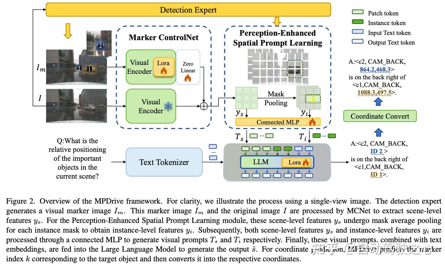 • MPDrive由两个组件组成:标记控制网络(MCNet)和感知增强空间提示学习(PSPL)。MCNet融合视觉标记图像以获取场景特征,而PSPL整合场景级和实例级视觉提示,增强多层次的空间理解能力。