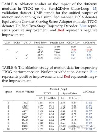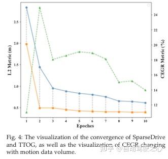 基于表9和图4,实验展示了不同运动数据量对模型性能的影响。结果表明,能够从运动数据中学习的TTOG在训练过程早期显示出快速收敛和显著的性能提升。具体来说,在仅仅两个epoch之后,TTOG达到了显著的性能水平,L2和Col.Rate大幅减少。另一方面,无法从运动数据中学习的SparseDrive在训练期间表现出较慢的收敛。直到最后一个epoch才达到最佳性能。相比之下,TTOG在第六个epoch收敛到接近最优的性能水平,展示出其利用运动数据并将其转化为有用规划数据的卓越能力。