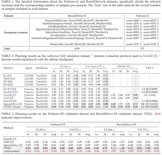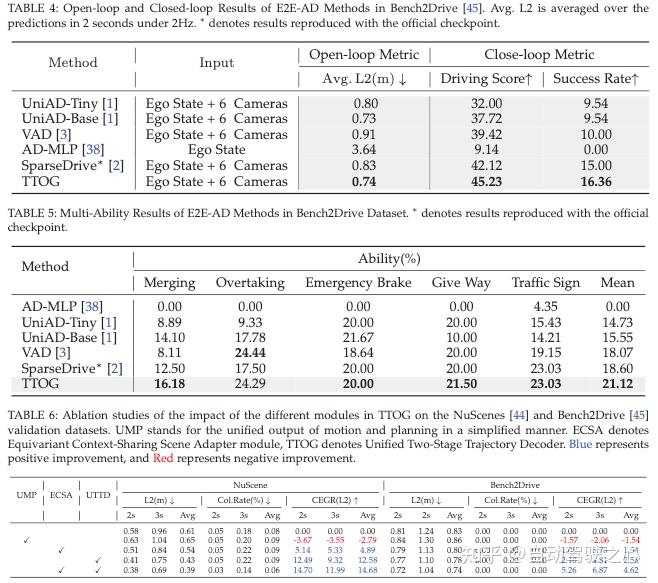 - 在开环评估数据集nuScenes和闭环数据集Bench2Drive上的广泛实验表明了我们方法的有效性。TTOG 取得了显著的改进,L2位移误差减少了22%,驾驶得分增加了34%。