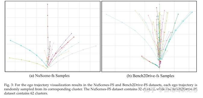 对于少样本测试,TTOG方法通过利用运动数据来增加稀缺的规划样本,从而提高端到端方法的性能。为了验证这一点,我们策划了两个少样本测试数据集——nuScenes-fs和Bench2drive-fs——通过以下系统过程:我们应用OPTICS自适应聚类算法对验证集中自车轨迹进行聚类,按群体大小对聚类进行排序,并从k个最小的聚类中选择样本来构建我们的少样本数据集。