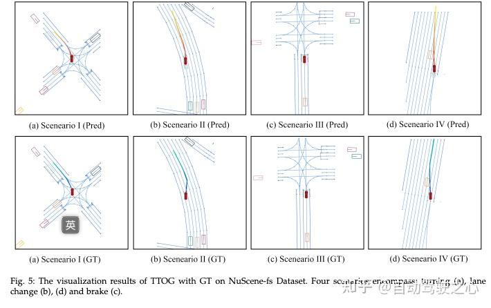 我们在NuScene-fs和Bench2Drive-fs上可视化TTOG的性能,重点关注少样本驾驶场景。对于NuScene-fs,我们选择了涉及转弯和换道的四个场景,而Bench2Drive-fs则包括转弯、换道和刹车。如图6和图5所示,TTOG在所有少样本数据集中均表现出稳健的性能,尤其是在刹车和换道场景中。这突显了其有效从其他车辆数据中转移知识以增强自身驾驶技能的能力。