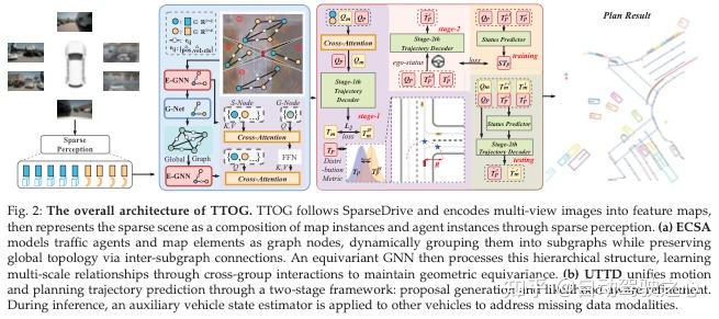 图2展示了所提出的TTOG的架构,该架构引入了一种新颖的端到端范式,整合了运动预测和轨迹规划。该框架通过联合学习,能够从运动数据中全面转移知识,从而增强规划性能。核心创新包括两个主要组件:1) 等变上下文共享场景适配器,它将交通代理和地图元素表示为图节点,动态地将它们划分为子图组,并通过子图间的连接保持全局拓扑结构。随后,等变图神经网络处理层次图结构,通过传播跨组交互来学习多尺度关系,以保持几何等变性。2) 统一的两阶段轨迹解码器解码过程包括提案生成阶段:生成基于结构化场景图的多模态轨迹假设。可能性感知细化阶段:通过整合自我状态动态来执行情境感知轨迹优化。为了实现统一预测,使用历史观察和环境背景训练辅助自我状态预测器。在推理过程中,该概率估计器对称地应用于所有代理,在相同的几何学习框架内实现统一的运动预测和自我规划。