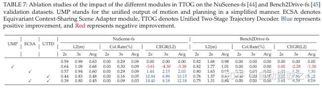 表6展示了TTOG模型在NuScenes和Bench2Drive数据集上的消融研究,分析了不同模块(UMP、ESCA和UTTD)对性能指标的影响,包括L2(m)、Col. Rate和CEGR(L2)。UMP模块通过统一运动和规划任务简化了模型架构。然而,实证结果揭示了在NuScenes上的次优表现,特别是在L2(m)和CEGR(L2)指标上。这表明简单地统一任务无法考虑到运动和规划任务之间的固有差异,从而导致性能下降。随着ESCA模块的引入,TTOG在Bench2Drive和NuScenes数据集上表现出显著改进。