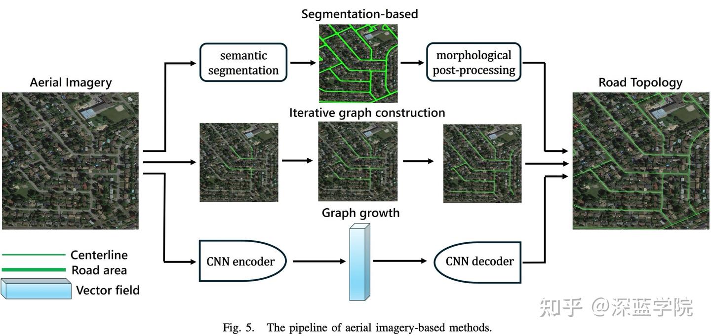 一些方法利用语义分割网络来识别航拍图像中的道路区域,然后进行形态学后处理以提取道路拓扑。替代方法包括迭代图构造和图生长方法。迭代图构造方法通过从道路网络中识别几个顶点,并且根据预定义的决策函数迭代地添加新的顶点和边来逐步扩展图。相比之下,图生成方法更为直接。这些方法采用矢量场编码策略,它们首先将航拍图像编码为潜在表示。神经网络随后用于预测图顶点,然后解码过程预测邻接矩阵并且重建道路网络。