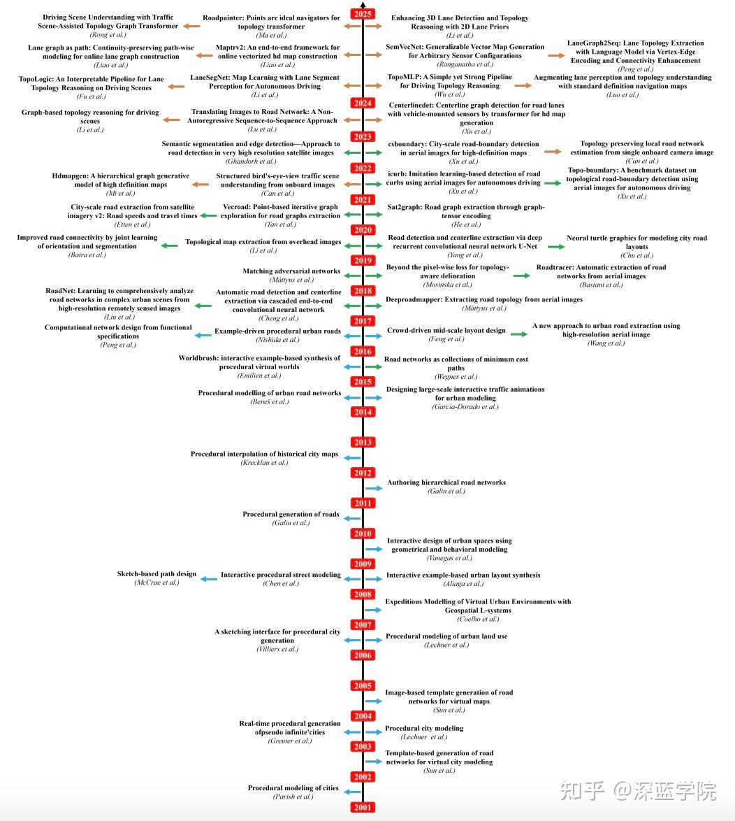 高精(HD)地图是自动驾驶的基础,它提供了道路网络、车道配置和交通元素的详细表示。在高精建图的各方面中,车道拓扑推理(理解不同车道如何相互连接和关联(见图3))对于安全且高效的自主导航尤为重要。在过去的二十年里,该领域发生了重大的演变,从简单的基于规则的方法发展到复杂的深度学习方法。