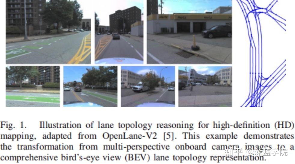 车道拓扑推理方法的发展大致可分为三种主要范式。早期的方法依赖于程序化建模技术,利用计算机图形学和基于规则的系统来生成道路网络。这些方法较为基础,它们依赖于人工设计的规则并且缺乏灵活性,因此受到限制。基于航拍图像方法的出现标志着一项重大转变,它引入了计算机视觉技术从俯视图中提取道路拓扑结构。然而,这些方法往往难以解决由建筑物和树木造成的遮挡问题,它们只能提取粗略的道路级网络。近年来,已经见证了基于车载传感器方法的出现(见图1),这代表着车道拓扑推理领域的最新进展。
