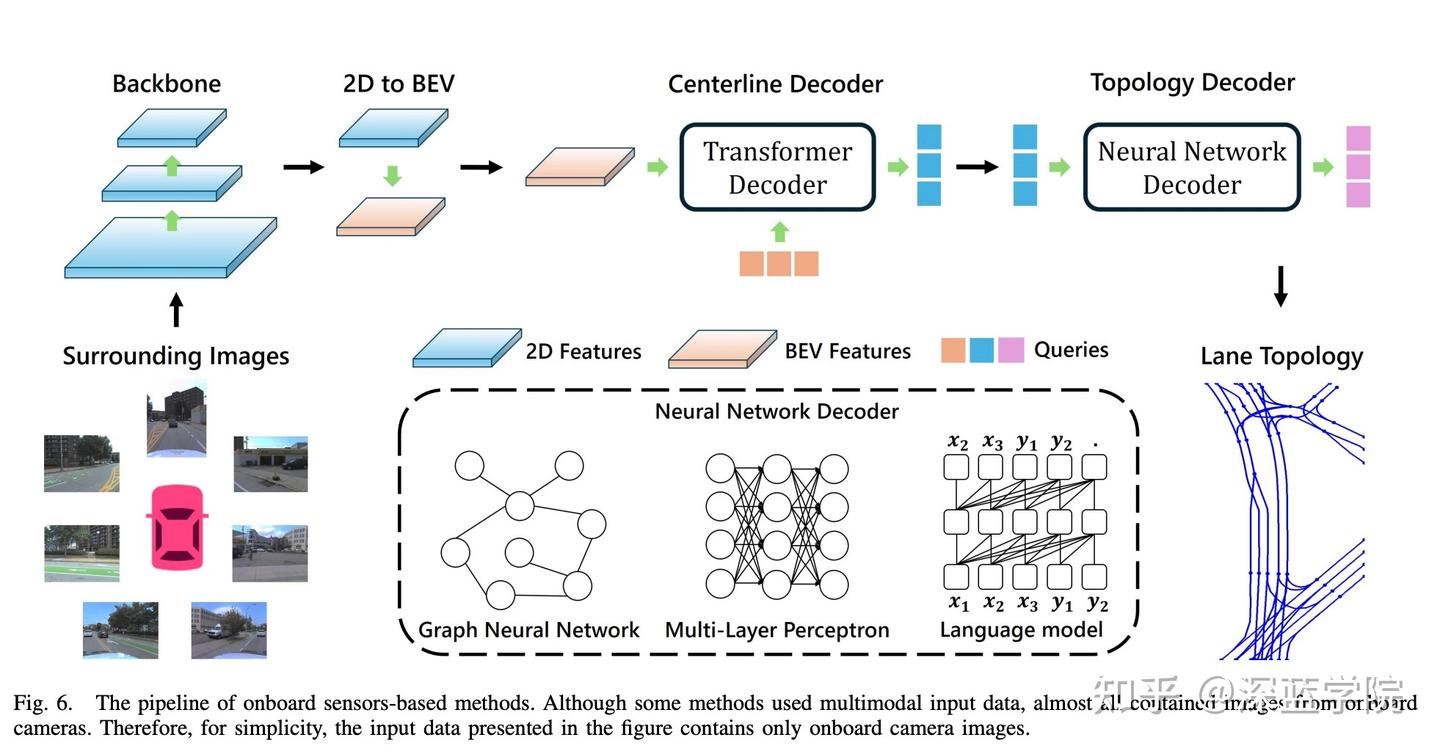 尽管基于航拍图像的方法为该领域引入了新的方法,但是它们仅限于提取粗略的道路级网络。此外,建筑物和树木造成的遮挡往往会使道路在航拍图像中不完整,从而影响结果的准确性。因此,这些方法不适合自动构建高精地图或者为自动驾驶汽车规划行为。为了解决这些局限性,基于车载传感器的方法逐渐兴起,它们利用从车载传感器捕获的单模态或者多模态数据来构建自车周围的详细车道拓扑。这些方法代表了高精建图的重大转变,它们提供了更高的准确性和适用性。图6展示了基于车载传感器方法的典型流程,包括主干网络、透视变换、车道解码器和拓扑解码器。