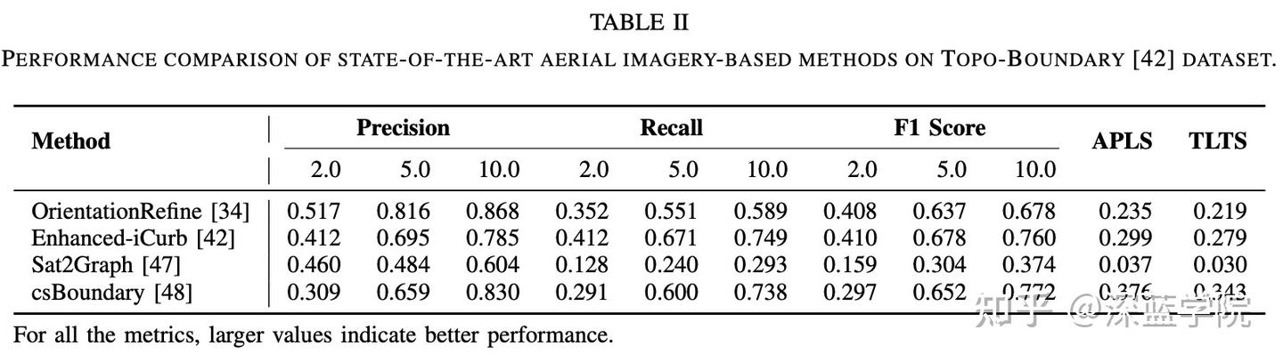 表格2展示了三种基于航拍图像的方法(基于分割、迭代图构建和图生长)在Topo-boundary数据集上的定量结果。