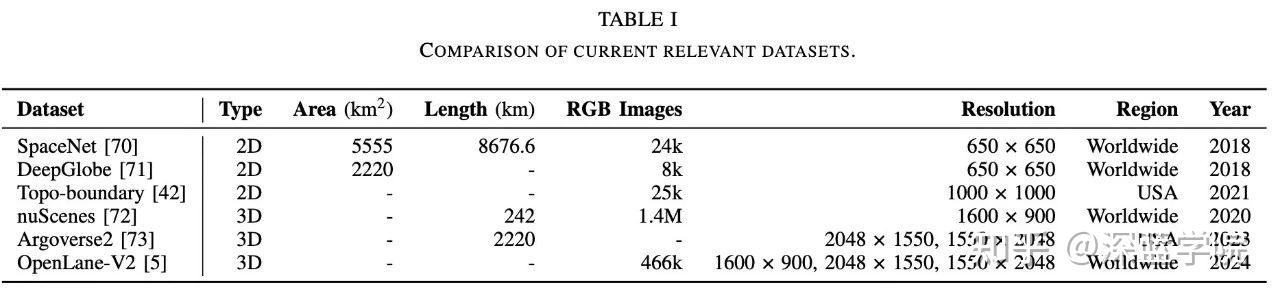 相关数据集可以分为2D数据集和3D数据集。表格1总结了这些数据集,它们通过提供针对特定研究需求而设计的多样化且高质量的数据,在推进道路拓扑提取和车道拓扑推理方面发挥关键作用。