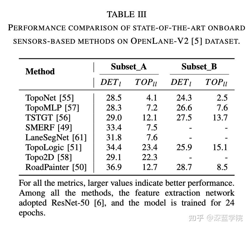 表格3展示了基于车载传感器的方法在OpenLane-V2数据集上的定量结果。