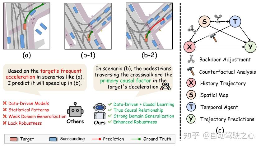 - 提出首个基于因果图(Causal Graph)的轨迹预测框架,明确建模空间地图数据(S)、时序智能体数据(T)与历史轨迹(X)对目标轨迹(Y)的因果关系。