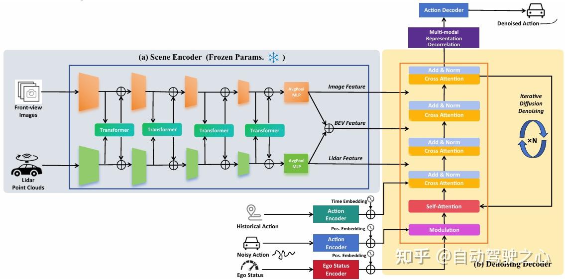 - 基于冻结的Transfuser骨干网络,构建多模态场景编码器 ,融合前视图像、激光雷达(LiDAR)及自车状态(Ego Status)信息,生成BEV(Bird’s Eye View)特征空间中的场景表征。通过Transformer模块