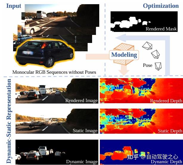 - 技术细节 :通过联合优化相机姿态与辐射场,结合语义监督的动态-静态分离策略,解决了传统方法对多传感器依赖的问题。