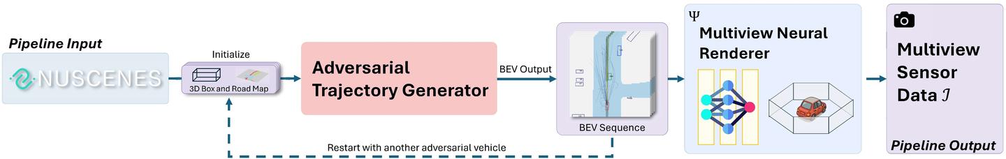 在自动驾驶领域,评估系统的鲁棒性和安全性是至关重要的。然而,现有的大规模自动驾驶数据集,如nuScenes、OpenScene等,主要包含自然交通流,缺乏刻意设计的具有挑战性的交互场景。这些数据集难以系统地评估自动驾驶系统在罕见但高风险事件下的表现。为了解决这一问题,先前工作已提出多种对抗性场景生成方法,但这些方法大多基于抽象的轨迹或鸟瞰图(BEV)表示,无法提供逼真的传感器数据来真正测试端到端自动驾驶系统