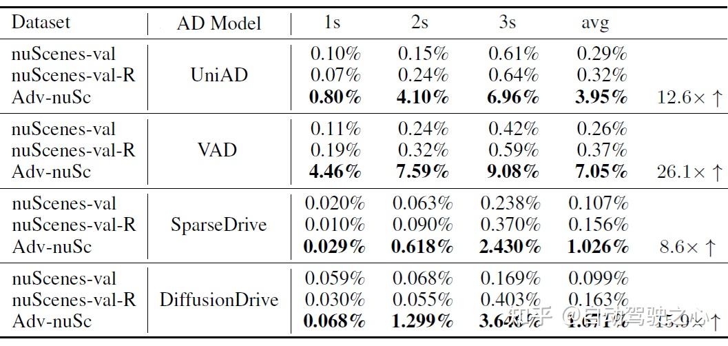 - 在对抗性数据集 Adv-nuSc 上,所有模型的碰撞率显著上升,暴露出在面临挑战性行为时的脆弱性与泛化能力不足。
