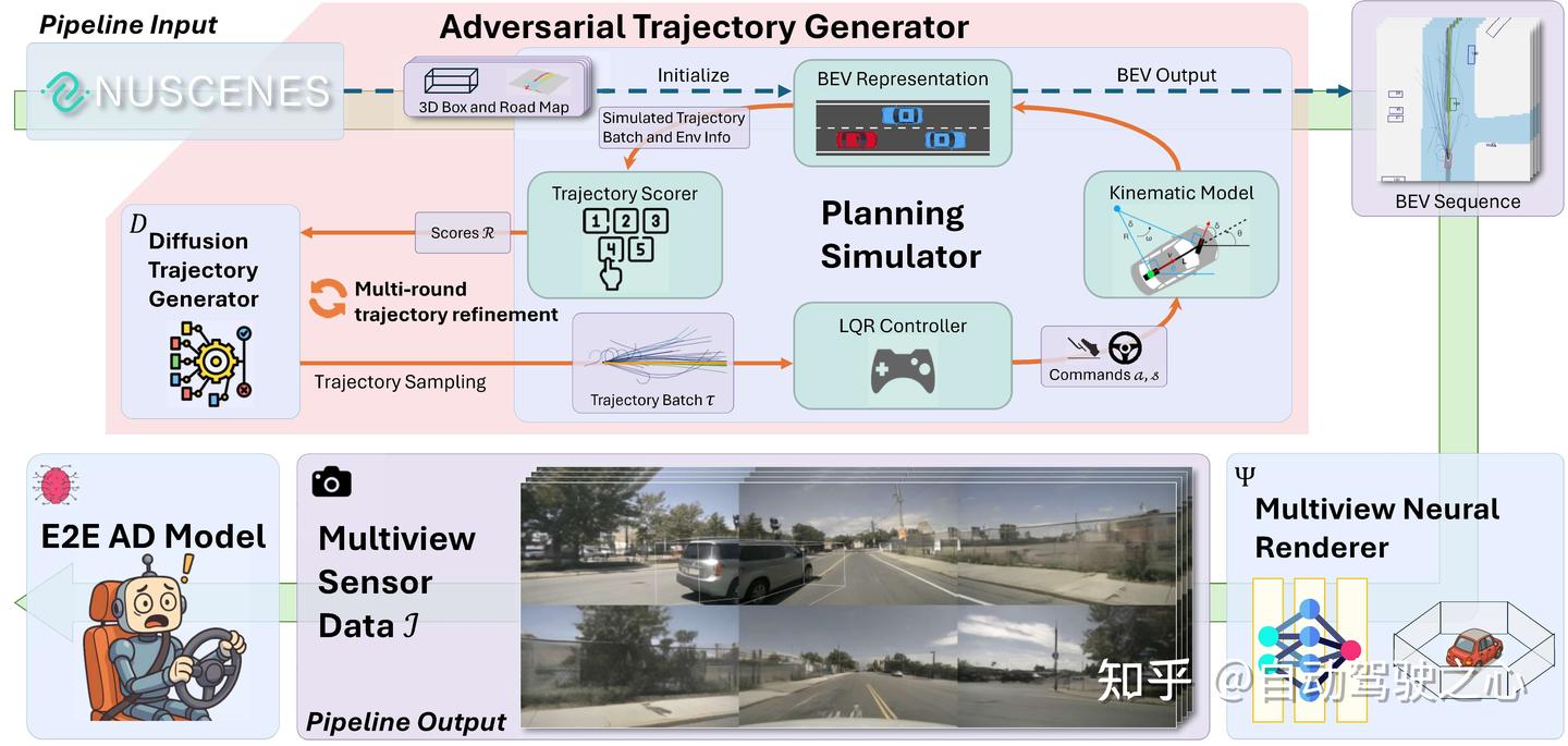 (end-to-end autonomous driving system)的极限。另有部分方法(如NeuroNCAP等)需要大量人力手动设计对抗性场景,或需要大量计算资源,难以实现复杂多样对抗性测试场景的批量生成。因此,如何自动、低开销地生成多样化、物理合理且逼真的对抗性驾驶视频,成为自动驾驶评估领域的一个重要空白。